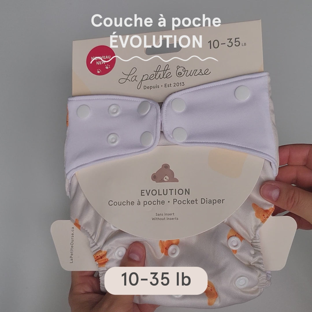 Notre toute nouvelle couche Évolutive s’adapte aux petits tout en douceur. Son intérieur est maintenant conçu avec un tissu athlétique léger et ses ailes extensibles offrent un ajustement parfait de 10 à 35 lb. Économique, écologique et ultra-confortable, elle grandit avec bébé sans compromis!